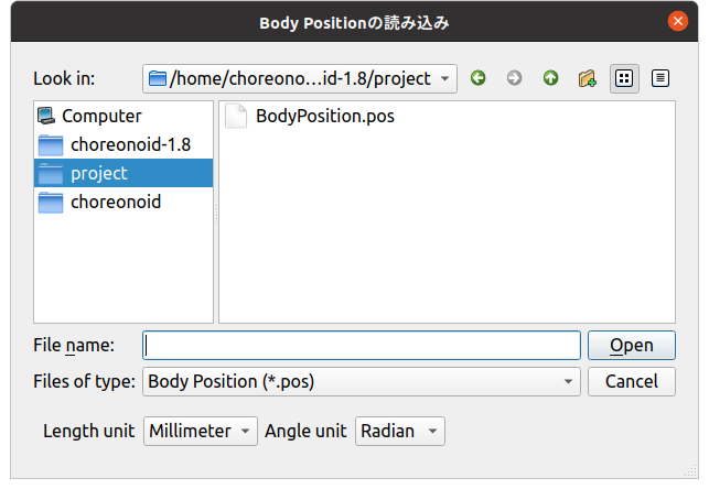 Now let’s load a BodyPositionItem from a file. When you select “Body Position” from the “File” - “Load” menu, the following file loading dialog is displayed: