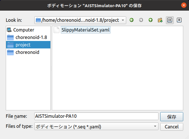 Select an appropriate directory and press the “Save” button. The motion trajectory data will be saved to a file. In this case, the default file name is “AISTSimulator-PA10.seq”. The file format is Standard body motion file format.