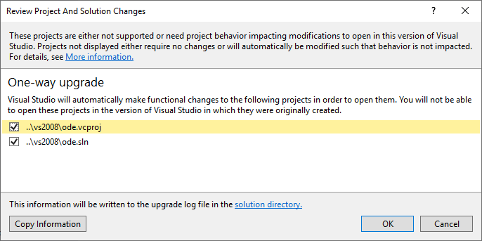 . When you do so, it will create a directory called vs2008, which contains the file ode.sln. (Since ode 0.12 supports only up to vs2008, it creates a solution file for 2008. ) When you launch VS2015 (or VS2017) and open this file, a dialog box will open to convert the solution. Click the OK button to run it.