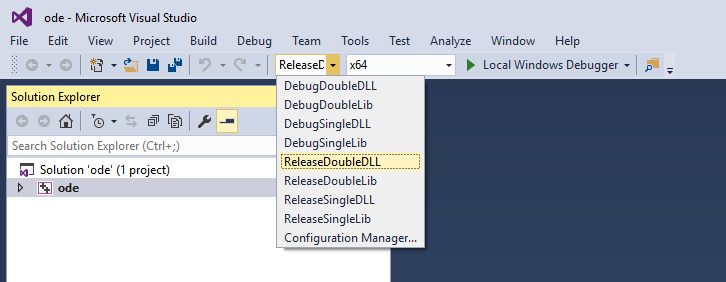 Using the converted solutions file, you will now perform a build. Select ReleaseDoubleDLL and x64 for the solution structure and confirm. If successful, a file named ode_double.* will be created in lib/ReleaseDoubleDLL.