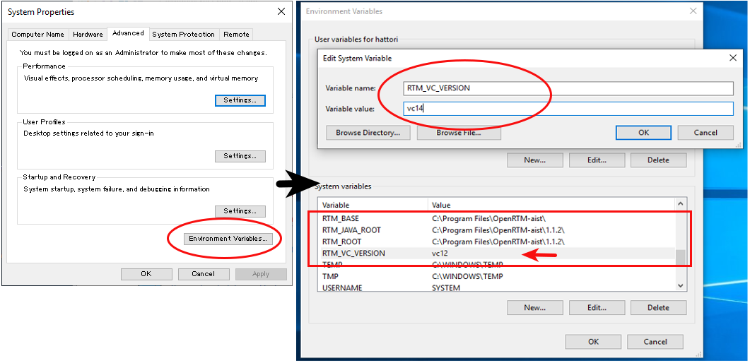 Immediately after installation, the RTM_VC_VERSION variable should be vc12. Double-clicking on this column opens the dialog box for editing, so change it to vc14 (meaning VC ++ 2015). Click the OK button and close all the dialog boxes.