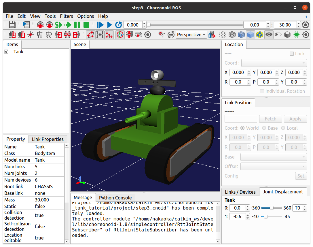 Let’s introduce the built controller to complete the project. As in previous steps, create a simple controller item as a child of the Tank item and specify “RttJointStateSubscriber.so” as the controller module. Name the item “RttJointStateSubscriber” as well. The item tree becomes: