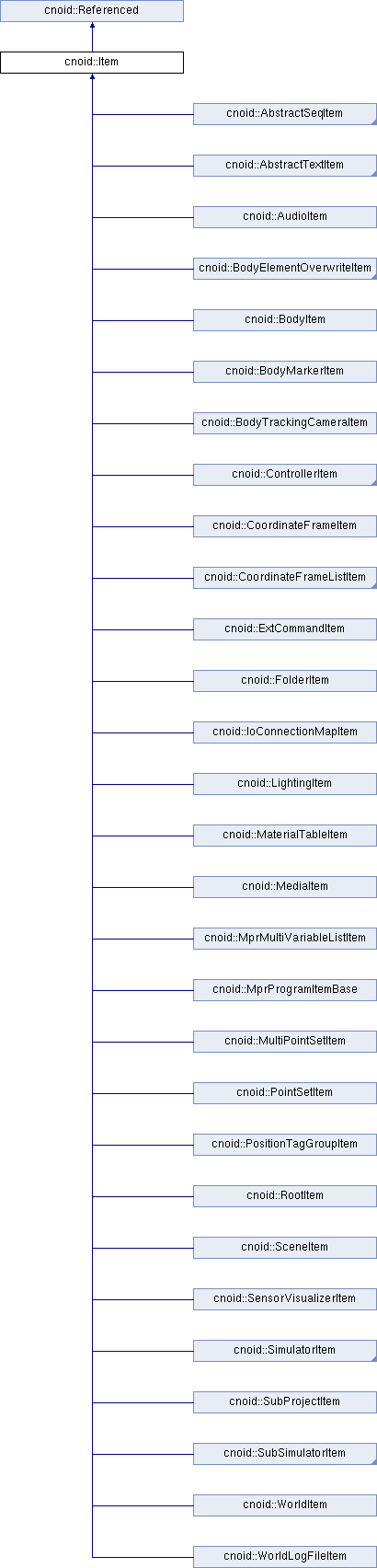 Reimplemented in cnoid::SimulatorItem, cnoid::BodyItem, cnoid::DeviceOverwriteItem, cnoid::MprControllerItemBase, cnoid::ControllerItem, cnoid::PointSetItem, cnoid::CoordinateFrameListItem, cnoid::RootItem, cnoid::MultiPointSetItem, cnoid::AISTSimulatorItem, cnoid::BodyMotionItem, cnoid::PositionTagGroupItem, cnoid::WorldLogFileItem, cnoid::WorldItem, cnoid::BodyTrackingCameraItem, cnoid::MprProgramItemBase, cnoid::BodyMarkerItem, cnoid::SceneItem, cnoid::LinkShapeOverwriteItem, cnoid::CoordinateFrameItem, cnoid::PythonScriptItem, cnoid::PythonSimScriptItem, cnoid::SimpleControllerItem, cnoid::BodyMotionControllerItem, cnoid::SubProjectItem, cnoid::MessageLogItem, cnoid::LightingItem, cnoid::IoConnectionMapItem, cnoid::MultiDeviceStateSeqItem, cnoid::SensorVisualizerItem, cnoid::MprMultiVariableListItem, cnoid::AbstractSeqItem, cnoid::KinematicSimulatorItem, cnoid::FolderItem, cnoid::MaterialTableItem, cnoid::AudioItem, cnoid::GLVisionSimulatorItem, cnoid::SimulationScriptItem, cnoid::MediaItem, cnoid::ExtCommandItem, cnoid::CollisionSeqItem, and cnoid::SubSimulatorItem.