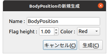 これまでと同様にPA10Pickupなどの適当なプロジェクトを読み込んで、Bodyアイテムに対してBodyPositionアイテムを生成します。 対象のボディアイテムを選択して、メインメニューの「ファイル」−「新規」−「BodyPosition」を選択します。 すると以下の新規生成ダイアログが表示されます。