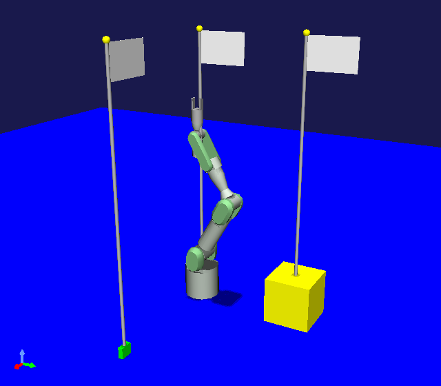 ここで表示されている旗は、各BodyPositionアイテムで記録されている位置を示すものです。 記録位置とX、Y座標が一致する床面上に、記録姿勢の水平向きと合わせて、旗が立つようにしています。 各BodyPositionアイテムのチェックをオン/オフすることで、それぞれの記録位置に対応する旗の表示が切り替わるのが分かるかと思います。 また、BodyPositionアイテムの記録位置を変更すると、旗の位置もそれに追従するようになっているので、そちらも試してみてください。