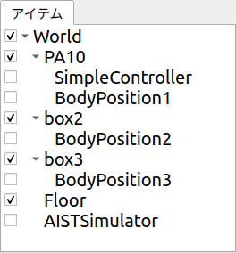 ここでは説明用に先のサンプルと同様PA10Pickupのプロジェクトを使うことにします。 プロジェクト読み込み後に各ボディアイテムに対してひとつずつBodyPositionItemを作成し、それぞれ現在位置の記録を行ったとします。 このときアイテムツリービューは以下の状態になっているとしましょう。
