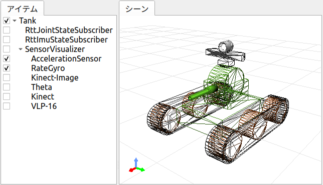 ステップ4ではTankロボットが搭載する加速度センサ、レートジャイロの状態をsensor_msgs/Imu型のROSトピックとして出力する機能を実装しました。このトピックをSubscribeすることで、ネットワーク経由でセンサの状態を取得し、様々な処理に活用することが可能となります。 ステップ5ではこの例として、ステップ3で構築した状態可視化用のChoreonoidノードにてセンサ情報のトピックをSubscribeし、Tankの状態表示を強化するものとします。