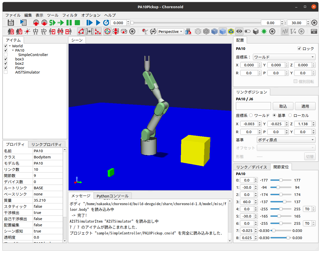 何を読み込めばよいか分からないという場合は、Choreonoid本体付属サンプルであるPA10Pickup.cnoidを読み込むとよいでしょう。ソースディレクトリのsample/SimpleController にこのファイルがあります。インストールをしている場合は、インストール先のshareディレクトリのprojectディレクトリにあります。このサンプルを読み込むと以下のような画面になります。
