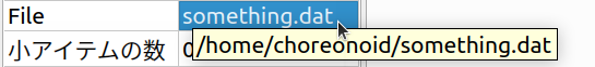 この型を介して出力すると、デフォルトではファイルパスからディレクトリを除去したファイル名の部分だけ表示されます。例えばfilepathの内容が "/home/choreonoid/something.dat" であるとすると、アイテムプロパティビューには "something.dat" と表示されます。その上で、ファイル名が表示されている箇所をマウスポインタでしばらく指していると、パス全体を表す文字列が以下のようにツールチップとして表示されます。