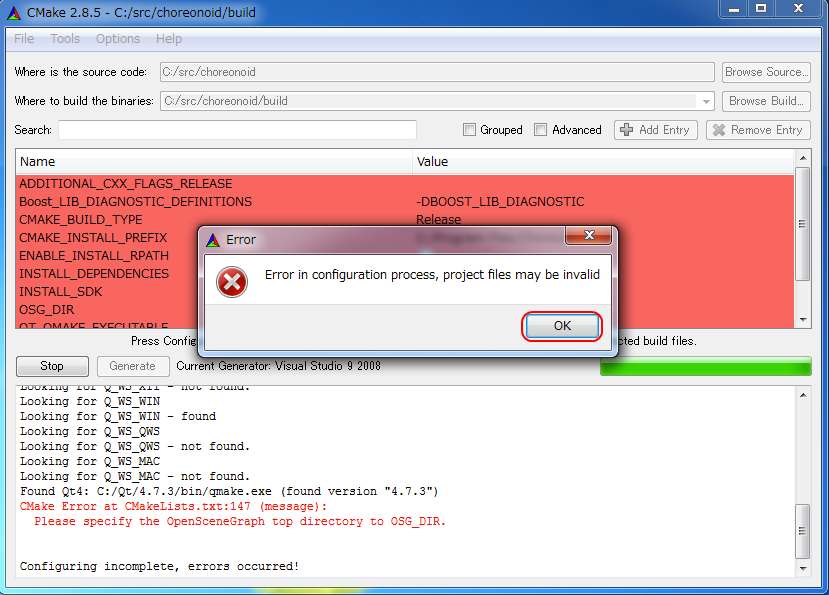 すると、CMakeのConfigureが進行し、再度、下図のようなエラーダイアログで停止します。 これは、OpenSceneGraphに関する設定が見つからなかったためです。 [OK] を押下して下さい。