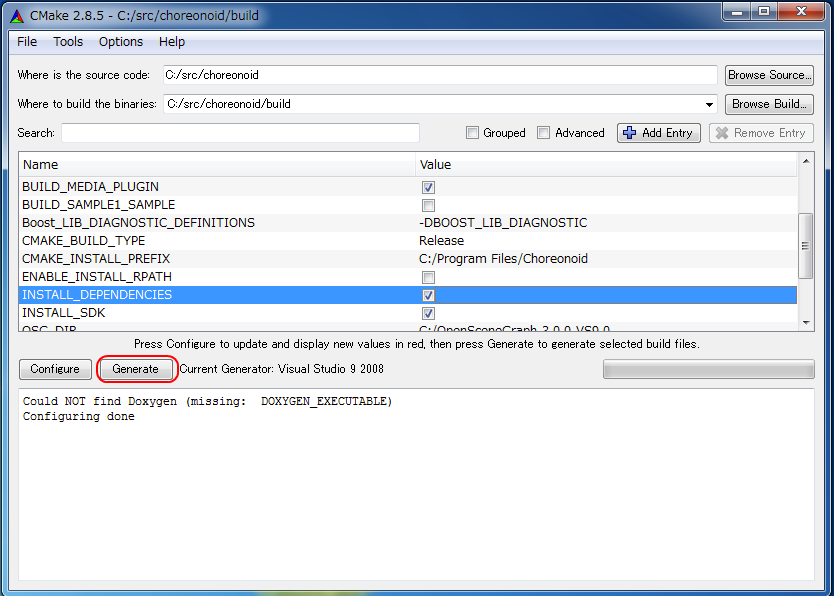 また、デフォルトではインストール先にコピーされるのは、コレオノイドのソースから作成したライブラリとコマンドのみであり、Boost や OpenSceneGraph 等のライブラリはコピーされません。もしコレオノイドの起動時に必要なファイルをすべてインストールさせたい場合には、 INSTALL_DEPENDENCIES の項目にチェックを入れておいて下さい。 INSTALL_DEPENDENCIES にチェックを入れない場合は、各ライブラリのDLLにパスが通っている必要があります。