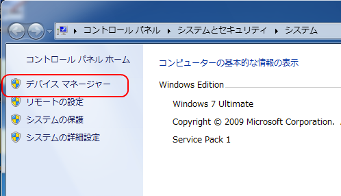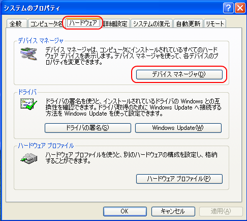 Windows XPでは、下図の ハードウェア タブをクリックで表示し、 デバイスマネージャー ボタンをクリックします。 Windows 7では、 システムのプロパティ の左側に デバイスマネージャー の項目がありますので、それをクリックします。
