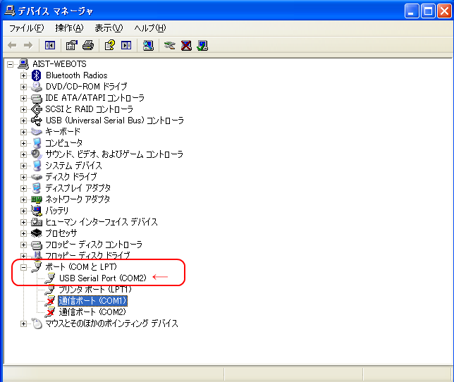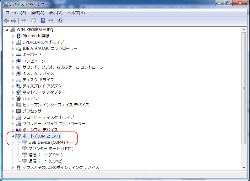 デバイスマネージャーは、PCに接続された機器が種類別にツリー上に表示されています。先程接続したシリアルポートは、 ポート(COM とLPT) 項目を展開すると、下図赤枠部分のように USB Serial Port (COMxx) または USB Device(COMxx) のように表示されています。この場合には、USBシリアルポート名は、COMxxとなります。 なお、USBシリアルケーブルを別のUSB ポートに接続変更すると、USBシリアルポート名も変更される場合がありますので、再度上記の手順で確認する必要がありますので注意してください。