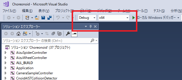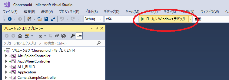 この状態で ローカルWindowsデバッガー をクリックしてChoreonoidを起動します。