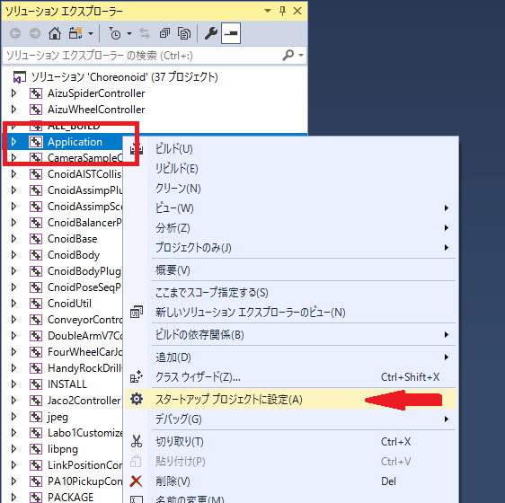 ソリューションエクスプローラを表示し、 Application を選択します。右クリックして表示されるメニューから スタートアップ プロジェクトに設定 を選びます。