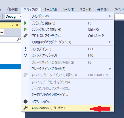 メニューから デバッグ - Applicationのプロパティ... を選択して、プロパティのページを開きます。