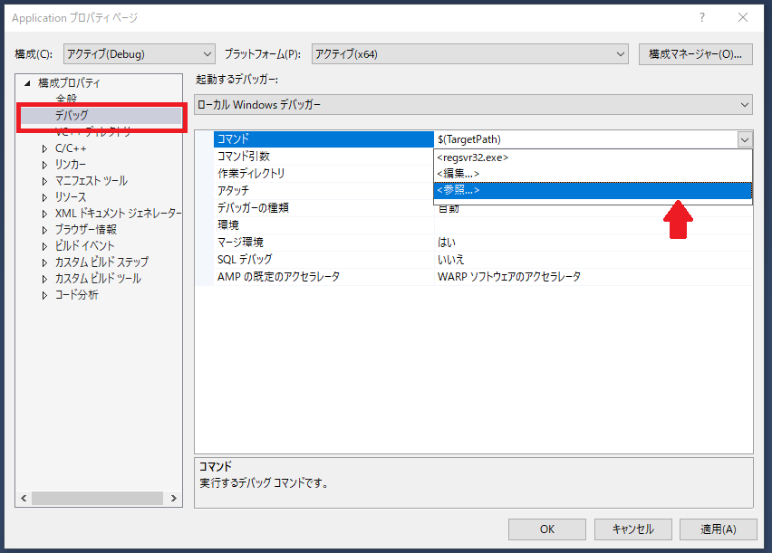構成プロパティの デバッグ を選択し、コマンドの欄をクリックすると右端に表示されるバタンをクリックして図のようなメニューを出します。ここで、 <参照...> を選択します。