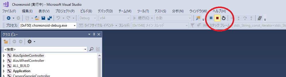 Choreonoidのウィンドウの下にVisual Studioのウィンドウが隠れている場合は、前面に出してください。