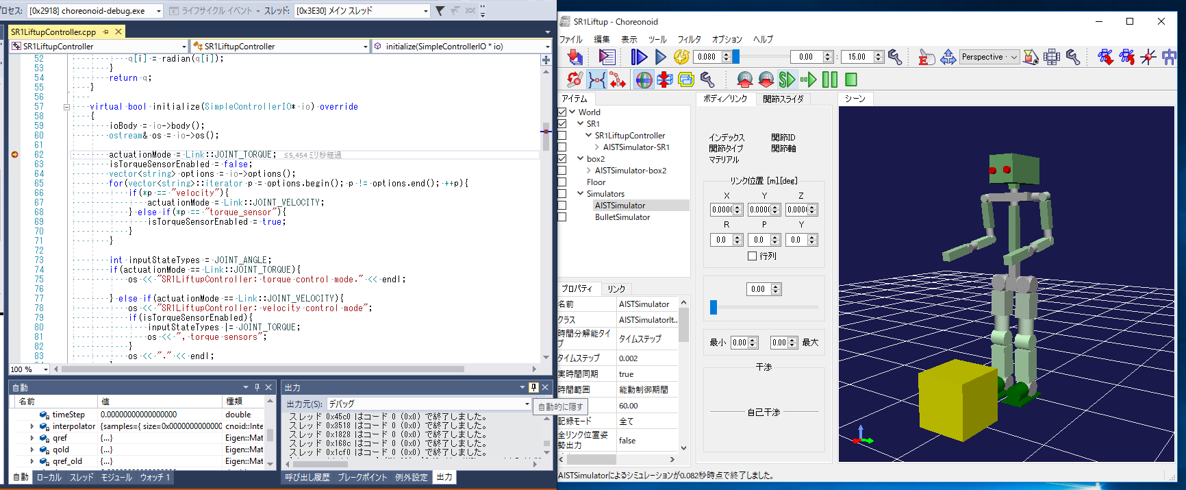 Choreonoidが起動したら、SR1Liftup.cnoidプロジェクトを開き、シミュレーションを実行します。